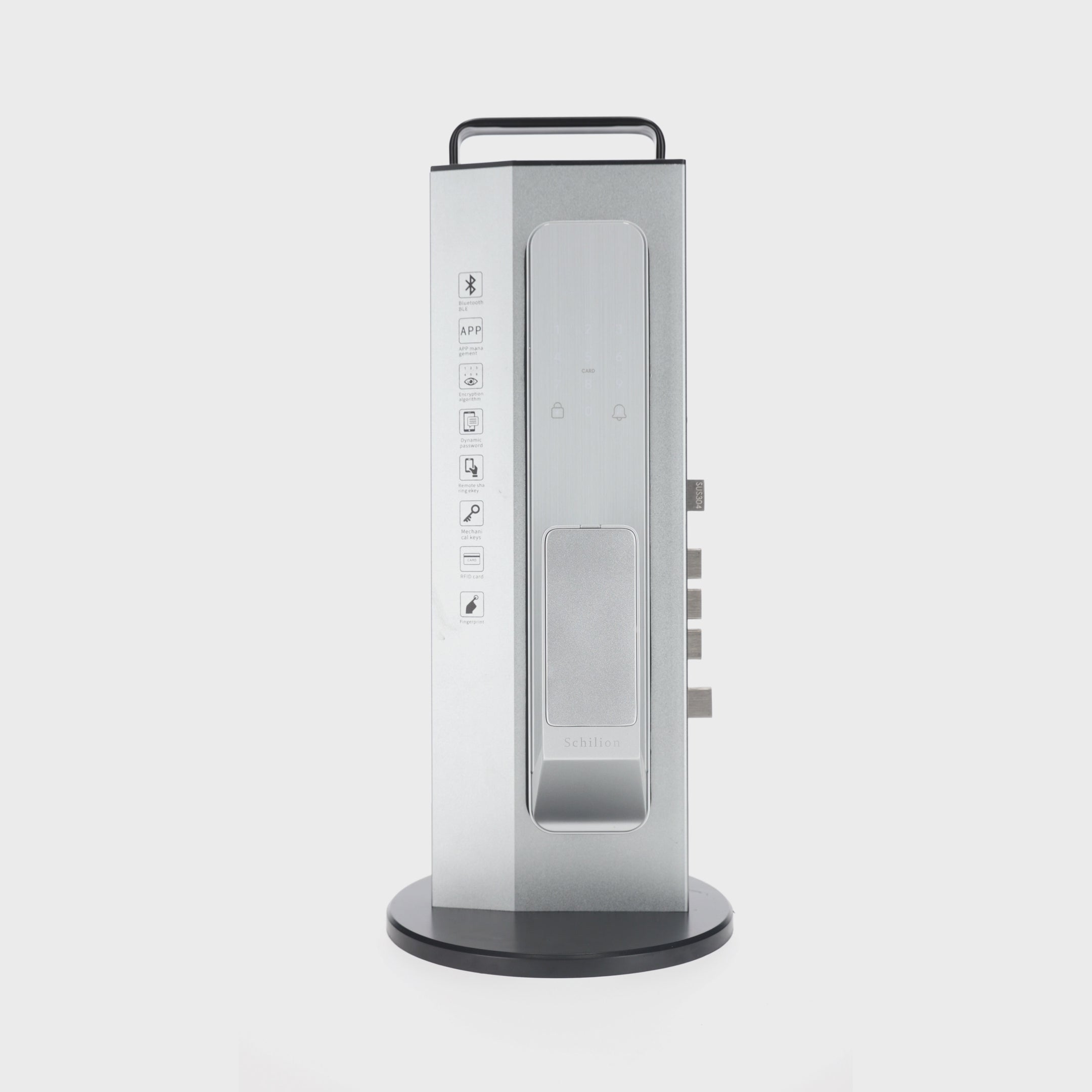 Métodos de apertura: Huella Dactilar, Smartphone Bluetooth APP, Código (pantalla táctil),Tarjeta de proximidad y Llave mecánica, NFC y Wifi (Requiere Gateway)